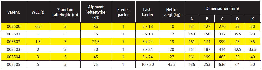 - Alle taljer er styrketestet ved 1,5 gange af WLL